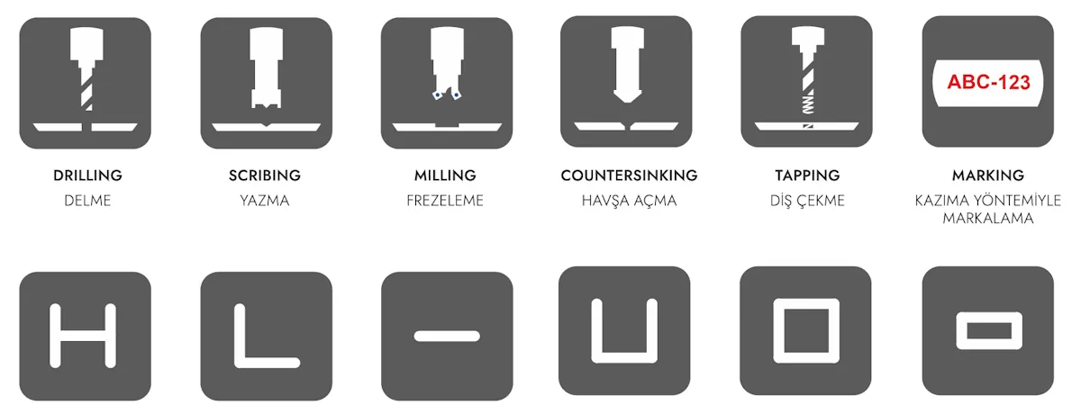 Bağımsız hareket özelliği, farklı işlemlerin birlikte gerçekleştirilmesini sağlar: Flanşın bir tarafı işlenirken, profil gövdesi ve karşı flanşta diğer işlemler (delme, markalama, kılavuz çekme, frezeleme vb.) bağımsız olarak aynı anda gerçekleştirilebilir.